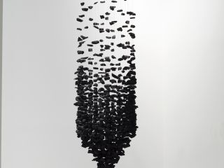 Bahk Seonghi’s works utilise forms, light, and space to evoke different emotions and feelings. The artists favour charcoal for its dark black colour, a pronounced contrast as the individual pieces are backed against the white installation space. The quality of the material itself induces negative and morose emotions, with light and the white spaces introducing a counterbalance, harmonising the elements. Some might consider this approach as influence from the Chinese philosophy of yin and yang, or the artist’s pursuit to create forms that convey sentiments through the play of three-dimensional positive and negative spaces. Bahk portrays a sequence of five water droplets, depicting a sense of motion and progression.