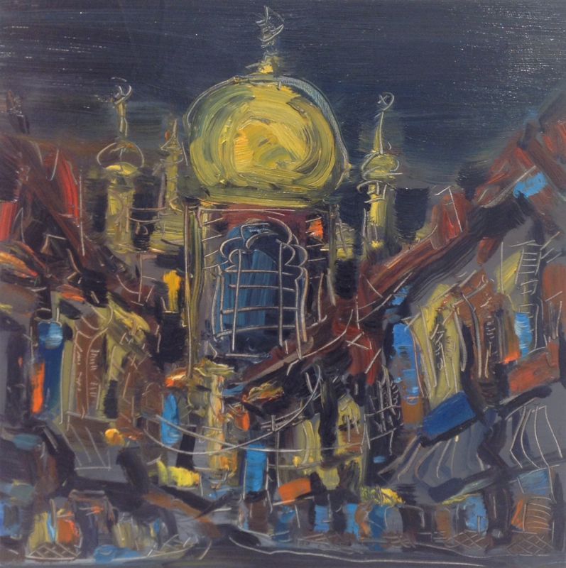 Towered over by the Specter Mosque dome, Hong paints a breathtaking starry night to overlook the now-quiet streets of the bustling Jalan PiNang. Following a meandering road that flows through the shophouse labyrinths, the viewer’s eye is drawn to both scenic expanse and the jostled housing- presenting the familiar site in a truly fantastical point of view.