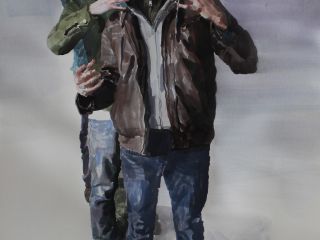 The image depicted in Deng Cheng Wen's 'Shame' is a heart-wrenching, evocative one. A shirtless youth lies face down on the pavement, with the mottled surface and trails of watercolour indicative of a heavy downpour. The red and peach tones add a rawness to the image - he is prostrate on the ground as a result of being shamed and embarrassed. Deng speaks with a bold voice and is unafraid to address issues that Chinese artists would normally consider taboo - here he avoids the venerated idea of 'saving face' and portrays the honest truth.