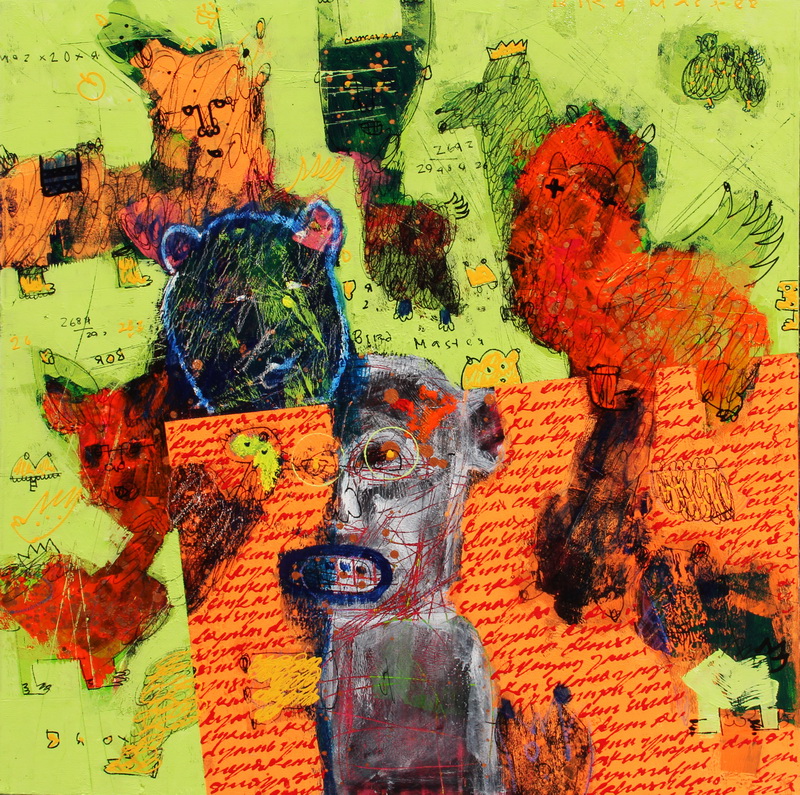 Dedy Sufriadi's "Bird Master" explodes with a raw, primal energy, a chaotic yet captivating tapestry of figures and symbols. The artist's distinctive, childlike style belies a complex layering of imagery, where human and animal forms merge with abstract scribbles and cryptic text. Bold, saturated colors clash and harmonize, creating a visually arresting and emotionally charged composition. The central figure, a human-like form with a haunting gaze, anchors the chaotic scene, while surrounding figures, some with animalistic features, suggest a dreamlike narrative. The cryptic text fragments scattered throughout the canvas add a layer of mystery, inviting viewers to decipher their meaning and construct their own interpretations of this enigmatic world. "Bird Master" is a visceral and evocative exploration of the subconscious, where the boundaries between reality and imagination blur.