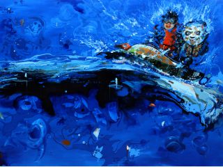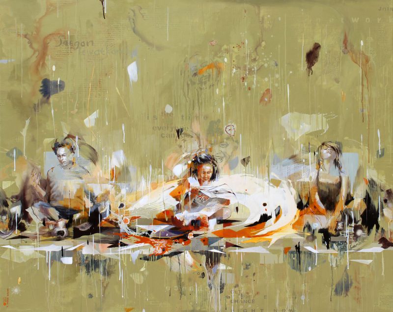 “Urban Dreamtime” tells about the pressures of modern life where young individuals have to move constantly to secure their place in the market economy. This involves high ambitions, to aspire for success and to compete with other also highly qualified, ambitious and motivated players in the field. For example the painting “Great News” shows a group of young people studying the job advertisements in the papers, hoping to reach a good position after having sent their job applications to the company. There is also lightness visible during this endeavor, people seem quite optimistic about reaching what they dream of.