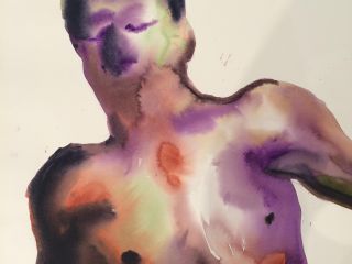 This semi-abstract painting by Liu Zhengyong features the form of a man, who is rendered in a highly stylized manner. Liu captures the contours of the man’s body through bold outlines, reflecting the softness and the wholeness of the human form. Inspired by the Expressionist movement, the artist renders the man using a vivid colour palette that mixes warm greens with cool purples, imbuing the work with a vibrant sense of energy. The evocative images of his subject starkly contrasts the vacant background, illustrating the force of human expression that is the bridge between our emotions and spirit.