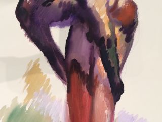 This semi-abstract painting by Chinese artist Liu Zhengyong features two figures, who are rendered in a highly stylized manner, hunching over on the ground. The work is highly textured, with the sweeping strokes of Liu’s brushstroke clearly visible, instilling a sense of life and energy within it, that is further reinforced by the vivid colour palette. Li piously layers paint upon layers on the already wet canvas, in order to create the unique texture, through which he expresses the weight that is present in the depth of his heart. The evocative image of his subjects starkly contrasts the vacant background, presenting a display of life in all its vigour, and illustrating the force of human expression that is the bridge between our emotions and spirit.