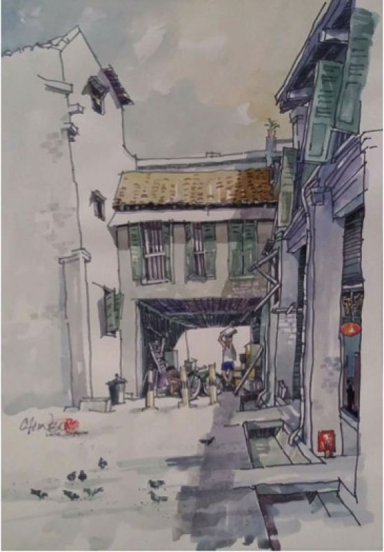 In this painting, Chin Chun Wah depicts the back lane of a row of shophouses, most likely those along the Singapore River. Done in the artist's signature style, using a mixture of watercolour and marker pens, this painting shows a side of Singapore that people might not get to see.