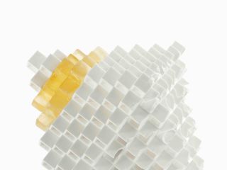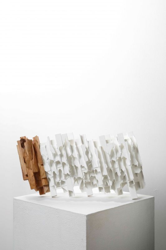 This contemporary sculpture by Japanese artist Takeuchi Kozo generates feelings of peacefulness in viewers. Takeuchi’s nuanced use of colour and material, such as the purity of white and the organic nature of wood, evokes a sense of harmony and tranquility. Yet the work is not simplistic, consisting of complex geometrical patterns of square tubed porcelain fused together in a kiln, that are subsequently chipped away at with a hammer. Using architectural forms to explore the theme of decay, Takeuchi creates pieces of art which are wholly unique and speak to the passage of time.