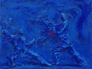 In this work by Yu Nancheng, two figures are shown in combat. Yu creates layers using a palette knife to depict the figures, enabling them to protrude from the canvas to produce an interesting surface texture. The vivid “China Red” paint he uses heightens the intensity of the work, and this is furthered by the dynamic poses of the figures, as their leading lines emphasise the directional flow of energy. Yu utilises contrasting colours to create an interesting visual experience, with cool blue specks standing out from the vibrant red dynamically. Through his visual mastery, Yu creates a profound work that conveys the power of movement in Tai Chi.