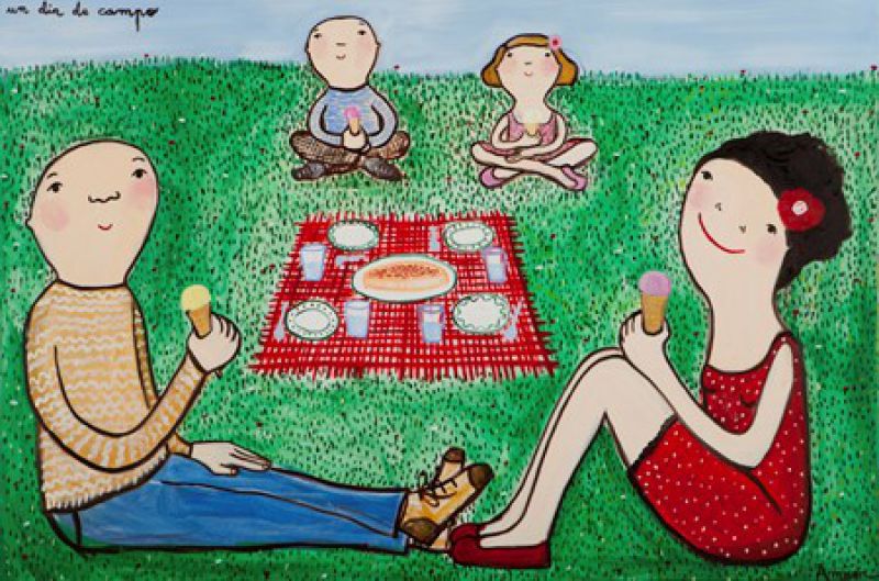 In this artwork by Eva Armisen, a family enjoys a picnic on a field of grass. Armisen dexterously utilises complementary colours to draw viewers into the work, as the vivid red of the mother’s dress and the picnic mat contrast the lush green of the grass, creating a sense of vibrancy and bringing life to the work. Armisen’s trademark child-like style is evident in her rendering of the family, as well as the sweet smiles they have while enjoying each other’s company, as well as the ice cream cones they are each savouring. Eva Armisen’s works often touch of subjects such as family, love and togetherness, and this is exemplified in this charming work that depicts a simple yet joyful moment of companionship in everyday life.