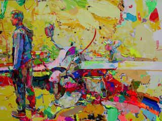 In this work, Ren depicts three workers, who carry heavy loads upon their shoulders. Ren incorporates elements of the Realism art movement, by portraying a social group often unacknowledged by the media, in a manner that is unrestrained by the traditional formality of classical portraiture. The artist’s captivating use of colour is also a nod to the expressionist movement, as he mixes both warm and cool toned colours to create a vibrant visual spectacle for viewers. Ren portrays these hardworking individuals in a contemporary manner, presenting them with dignity and highlighting their inner spirit.
