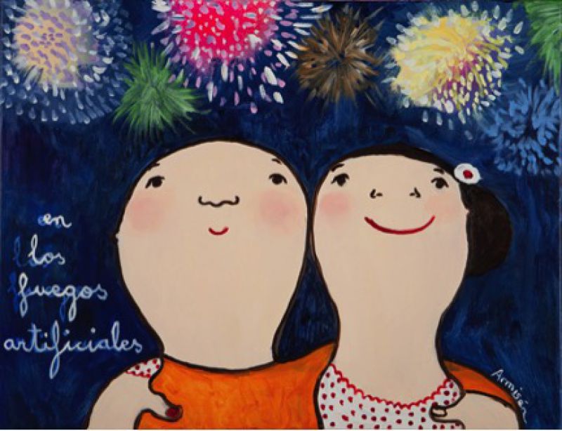 In this spirited painting by Eva Armisen, a couple embraces each other as they watch a firework show. The brilliance of the fireworks is emphasised by the contrast of their bright colours to the cool toned blue of the night sky, while the short brushstrokes Armisen uses to depict their explosion further reinforces the sense of spectacle. The couple are depicted in Armisen’s trademark style, with sweet smiles and a child-like rendering. The sense of joy is profound, which reflects Armisen’s aim in her work, to remind viewers to treasure the moments experienced in their lives, no matter whether they are extraordinary or everyday.