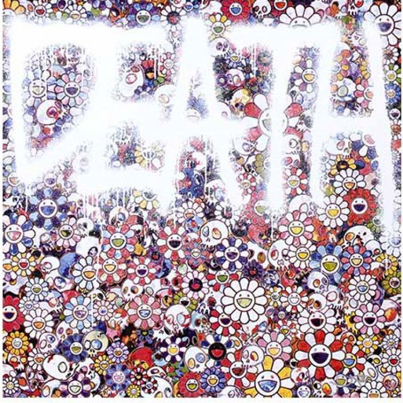 Drawing from traditional Japanese painting, sci-fi and anime, Takashi Murakami creates paintings, sculptures, and films populated by repeated motifs and mutating characters of his own creation. This striking work explores the dichotomy of joy and terror, through the contrast between the numerous beaming flowers and the menacing skulls that are interspersed throughout the painting. Both oppositional and parallel, these two symbols are reminders of the fragile vibrancy of life and the inexorable passage of time. This theme is further encapsulated in the word, ‘Death’, that spans across the canvas, with its humongous scale serving as a further reminder of the inevitable last stage of life.