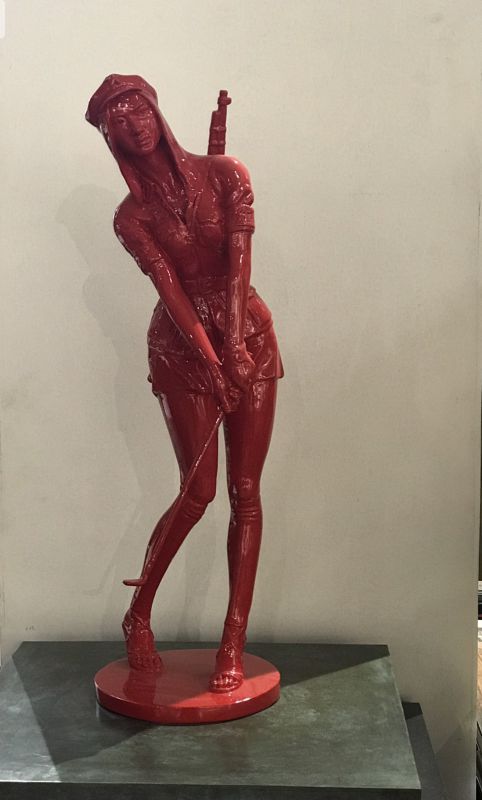 Having spent his youth in China during the Cultural Revolution, this period in the country’s history features heavily in Huang Gang’s works. This sculpture depicts a female soldier who is rendered in vivid red, a colour highly symbolic of the country. The woman appears to be swinging a golf club, yet on her back she carries a rifle, a striking reminder of the period and a juxtaposition of relaxing leisure amidst mass social upheaval. The artist’s use of symbols synonymous with the Revolution in his captivating works allow for a degree of ambiguity regarding his ideological standings or political sentiments, leaving the symbols open to interpretation.