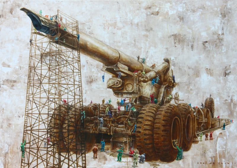 Vani Hidayatur Rahman has made a name for himself with his distinctive and realistic style. With his highly complex paintings that are adorned with detailed embellishments, Vani imbues a strong concept and story into each piece and addresses pertinent political, social and environmental issues that span war to pollution. In his artwork entitled "Unity," Vani depicts a large ark - a motif that has been reiterated by other Indonesian painters such as Widayat and Amrus Natalya. However, Vani presents his own interpretation of the timber vessel by painting it in an unfinished stage of construction and glory - a group of workers on deck are still sawing, carrying wooden beams and measuring for dimensions. The flurry of activity is painted from a birds-eye view and aerial perspective, with the entire structure and frame visible - allowing the viewer to feel as if he or she is an omniscient being looking down from above.