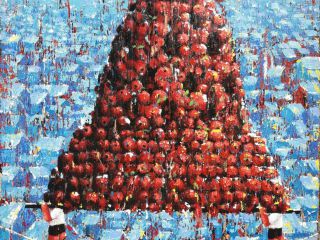 Vani Hidayatur Rahman has made a name for himself with his distinctive and realistic style. With his highly complex paintings that are adorned with detailed embellishments, Vani imbues a strong concept and story into each piece and addresses pertinent political, social and environmental issues that span war to pollution. In his artwork entitled "Unity," Vani depicts a large ark - a motif that has been reiterated by other Indonesian painters such as Widayat and Amrus Natalya. However, Vani presents his own interpretation of the timber vessel by painting it in an unfinished stage of construction and glory - a group of workers on deck are still sawing, carrying wooden beams and measuring for dimensions. The flurry of activity is painted from a birds-eye view and aerial perspective, with the entire structure and frame visible - allowing the viewer to feel as if he or she is an omniscient being looking down from above.