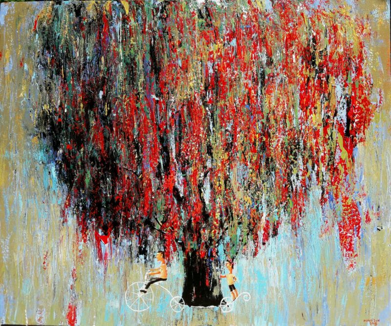 Born in 1977 in Yogyakarta, Indonesia, Hono Sun is an award-winning artist who specializes in Surrealist imagery, bold strokes and evocative colours. As a pluralist, the artist often brings in elements of Cubism and Fauvism, with a focus on painterly qualities over representation. Employing a striking color palette, the artist often uses contrasts between vivid colours to create visual impact and enhance the fantastical elements of his work. Conceptually, the artist uses representational subjects and juxtaposes them in a manner more akin to the abstract, allowing the audience to ponder upon his alluded social issues and layered emotions behind subject, colour and stroke.