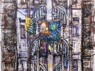 Ho Chee Lick's "Siglap Road" is a pastel drawing that captures the essence of a building, likely a shophouse, in the Siglap area of Singapore. The artwork features a layered composition, with the building's facade rendered in a mix of white, green, and gray pastels, suggesting age and weathering. The artist's use of bold strokes and contrasting colors creates a sense of depth and texture, particularly in the depiction of the building's architectural details. The sky, rendered in vibrant blues and yellows, adds a dynamic backdrop to the scene. The inclusion of a basket and a pot in the foreground adds a touch of everyday life to the image. The artwork is signed and dated "2018" in the lower right corner. The artist's signature style, characterized by expressive lines and a focus on urban landscapes, is evident in this piece.