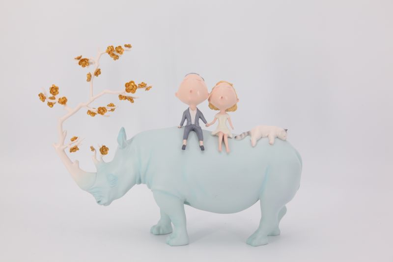 This charming sculpture depicts a couple and their sleeping cat, sitting on a blue rhinoceros. The expressions on the couple’s faces recalls the innocence of childhood and their intimacy is illustrated through their affectionately clasped hands. The motif of a couple is not unusual in Wu Qiong's works, and their relationship suggests one of assurance, love, and hope, as they take comfort in the knowledge that the other will always be present to support them through life’s obstacles. A tree whimsically grows from the rhinoceros’ tusk, with brilliant gold flowers blooming from the branches. The rhinoceros is one of the ‘Eight Precious Things’ in Chinese culture, symbolizing happiness and protection against adversity, and thus the couple sitting on this majestic animal signifies the journey they are on together towards a joyful life filled with better things to come.