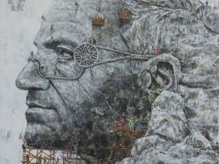 Vani Hidayatur Rahman has made a name for himself with his distinctive and realistic style. With his highly complex paintings that are adorned with detailed embellishments, Vani imbues a strong concept and story into each piece and addresses pertinent political, social and environmental issues that span war to pollution. In his artwork entitled "Unity," Vani depicts a large ark - a motif that has been reiterated by other Indonesian painters such as Widayat and Amrus Natalya. However, Vani presents his own interpretation of the timber vessel by painting it in an unfinished stage of construction and glory - a group of workers on deck are still sawing, carrying wooden beams and measuring for dimensions. The flurry of activity is painted from a birds-eye view and aerial perspective, with the entire structure and frame visible - allowing the viewer to feel as if he or she is an omniscient being looking down from above.