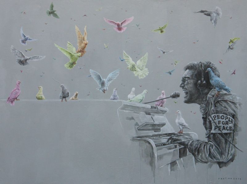 This painting by Indonesian artist Vani features the musician John Lennon fervently singing and playing a piano, while a myriad of birds surround him and soar above him. The work’s title is a nod to Lennon’s iconic song and ode to harmony, ‘Imagine’. Like the doves that are a traditional symbol of peace, in his own right, Lennon has become a symbol of peace as well. While most of the work is rendered monochromatically, the birds are depicted in a myriad of colours, creating an explosion of vibrancy that is reflective of Lennon’s music, which has helped spread a message of love and has brought people of all backgrounds together.