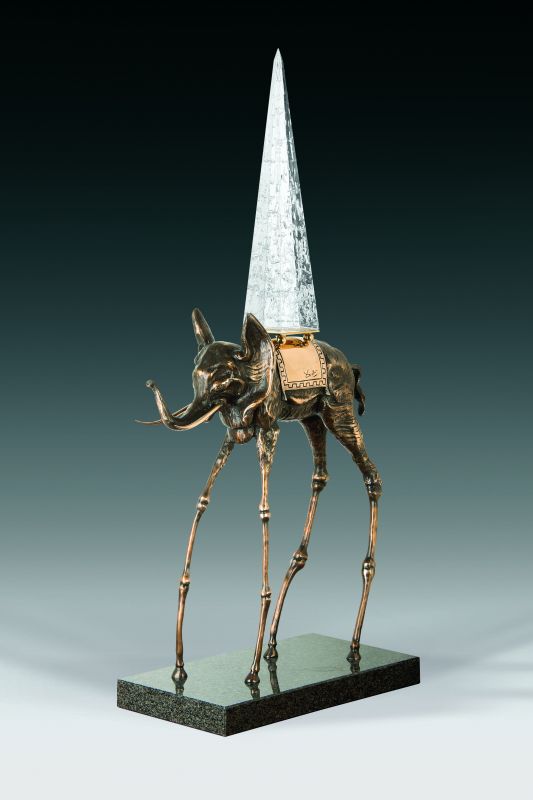 The image of an elephant carrying an obelisk is portrayed in one of Dalí’s best-known paintings The Temptation of St Anthony (1946). Four elephants led by a horse in a desert landscape, carry symbolic objects which represent various temptations. The obelisk, symbol of knowledge and power, is Dalí’s homage to Gian Lorenzo Bernini’s sculpture in Rome. Dalí’s elephants have exaggeratedly long legs which raise them up towards the sky. These thin, multi-jointed legs juxtapose with the heavy body of the elephant. The obelisk alludes to a tiring burden, yet the artist distorts reality making it weightless, an illusion of it almost floating above the saddle. The combination of these contradictory elements create a sense of disarray and metaphysical imbalance that can only exist in a dream-like world. The image of the elongated legs in addition to the tall pointed obelisk, alludes to man’s pursuit of “reaching higher”. The legs of the elephant originally had claw-like feet during the sculpture’s creation. Doubtful of this element, Beniamino Levi President of the Dalí Universe, approached Dalí to modify it. After initial resistance and with Gala’s support, the feet changed to horses hooves.