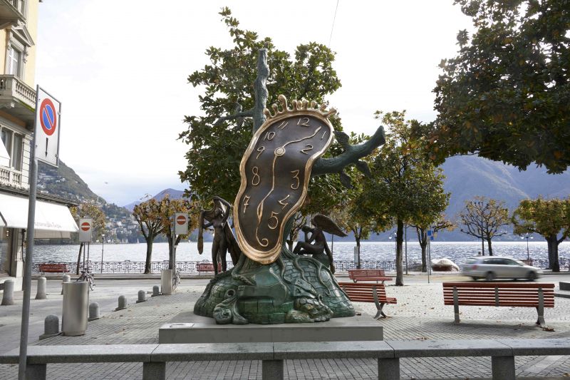 The classic Dalinian theme of time takes centre stage in this sculpture. Dalí’s soft watch is draped against a tree whose roots entwine a stone. The watch is stretched, its malleable form seems to take the shape of the tree. The trunk sprouts new roots and leaves grow from the branches, symbolizing new life. In the sculpture, a crown adorns the watch. The terminology “crown of a watch” usually refers to the mechanical device which allows us to wind and set the hands of a clock. Without this important component, a watch won’t wind and cannot keep time. Dalí plays with this notion, since time on a Dalinian watch is timeless, irrelevant and cannot be set. Dalí’s watches have no motion and lose all meaning, the essence of time is lost and melts away. The crown of the watch, in this case can be interpreted as a royal crown, symbolizing the “nobility” of time, indicating time’s mastery over human beings. Time reigns supreme over man, governing our existence in the real world, immutable and uncontrollable by man. By the side of time stand two recurring images: a meditative angel representative of the Spirit, and a female figure covering herself with a shawl.