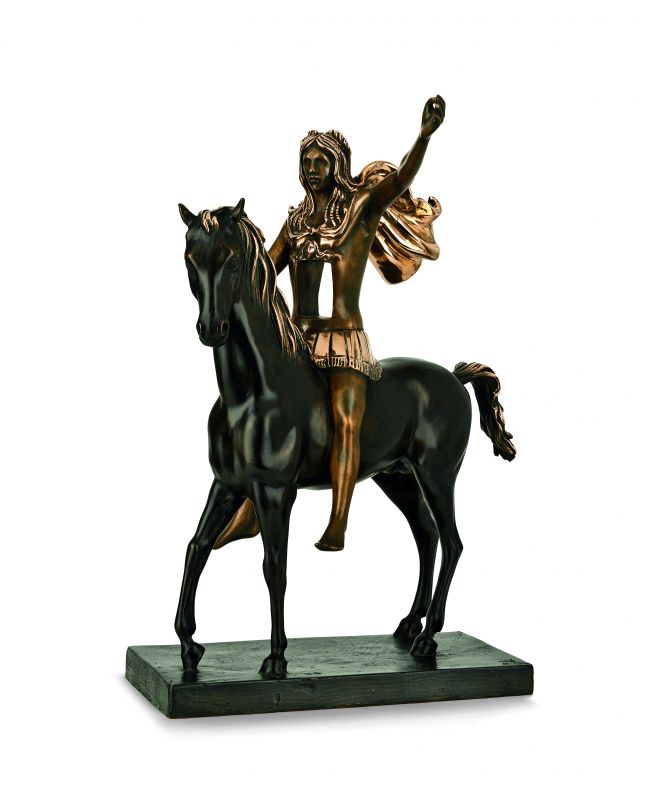 This sculpture illustrates King Louis XIV, also known as the Sun King, who reigned in France during the 17th and 18th century. Dalí depicts a striking warrior on horseback, going into battle, with his arm raised in a victory salute. Dalí painted the Sun King as gouache in 1971 and it was here the image of the Surrealist Warrior was born. The image of the warrior, as created by Dalí, represents all victories, real and ethereal. Dalí’s surrealistic interpretation of the warrior includes the addition of a window of light, portrayed through a hole in the chest, inspiring us to see that which is not evident, as well as that which encompasses the dream world beyond everyday reality; Dalí was convinced that heaven could be found in the heart of the man who believes. Horses are found ubiquitously in Dalí’s artworks, representing freedom and power. Dalí’s Surrealist Warrior portrays a serene horse, the addition of the bareback warrior implying certain victory and royal supremacy.