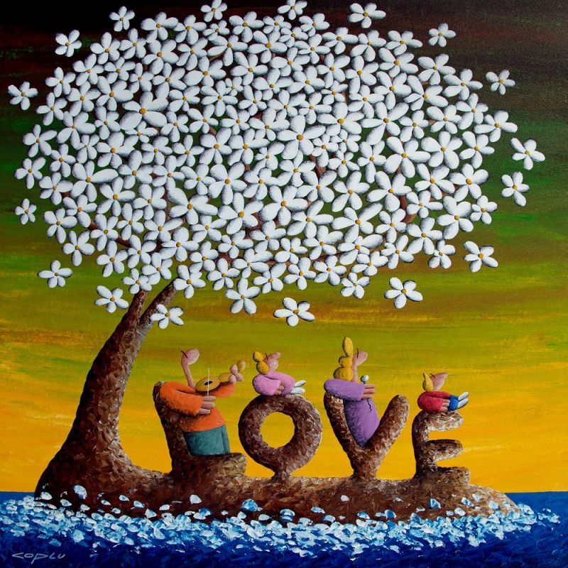 Resting against the word “LOVE” that is carved out of the tree trunk, a family is depicted sailing off into the seas ahead. A canopy of white flowers sprouting from the tree trunk is stabilising and holding the tree trunk afloat. The white flowers a representation of a pure and trusting love that help the family sail forward as one. Through this piece, Coplu illustrates a pure love and bond as the foundation for a family to sail forth.