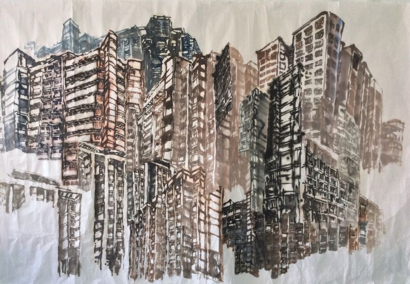 Pending is an area in Bukit Panjang, located in the west of Singapore. Hong Sek Chern captures a scene of the various types of HDB flats in ink, in memory of certain blocks that are no longer present as she used to view them. The positioning of defined flats against faded ones show their transient nature, with their existence dependent on the behest of time and government.