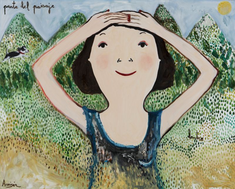 Eva Armisen's "Part of the Landscape" seamlessly blends human presence with the natural world. A central figure, rendered with Armisen's signature simplified features and gentle expression, frames her face with her hands, creating a window to the landscape behind. Rolling hills, dotted with texture and subtle color, fill the background, suggesting a serene and idyllic setting. A small dog adds a touch of playful spontaneity. The inscription "parte del paisaje" (part of the landscape) reinforces the artwork's theme of harmonious integration. Armisen's use of soft colors and delicate brushstrokes creates a sense of tranquility and belonging. The artwork invites viewers to contemplate their own connection to nature, reminding us that we are all integral parts of the world around us. "Part of the Landscape" is a gentle reminder of our interconnectedness, a celebration of the quiet beauty found in everyday moments.