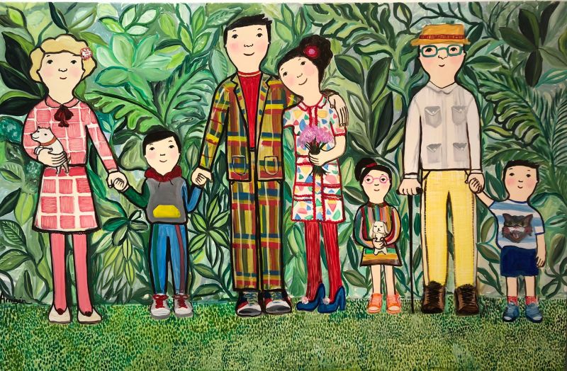 Armisen is well known for heartwarming family portraits, and this is no exception. Here, a family lines up to get ready for a photoshoot, as huddling close to the other draws a harmonious family portrait. It is the whimsical choice of colours varying from one saturated hue to other that evokes a joyful scene to gaze at.