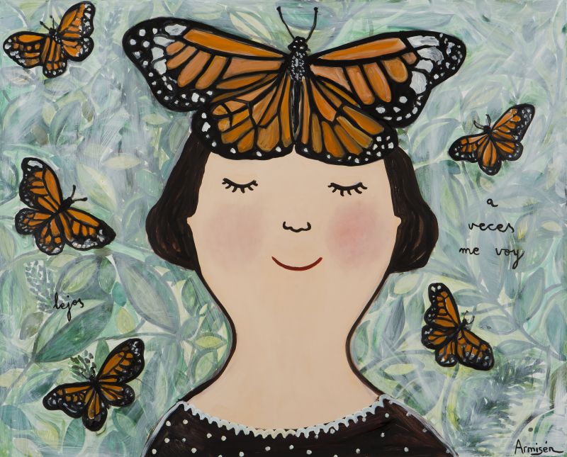 “Sometimes I go” is a whimsical and magical work that instantly exudes a sense of peace and tranquility. Set against lush and rich patterns of leaves and foliage, Eva Armisen depicts a woman with her eyes closed in joy and contentment. Beautiful monarch butterflies with their distinctive orange colourations and black and white markings fill the canvas, with one butterfly even settling on the woman’s head. As butterflies often symbolize freedom and transformation, this painting expresses the simple joys of life if we just take the time to take a breath, and relax.
