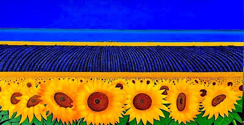 An almost three dimensional effect is obtained through the thick and heavy brush strokes of Ronnie Ford, that layer the acrylic onto canvas. In seeking harmonic balance between the use of strong colours, Ford concentrates on the essence of what he is painting, focusing on the key energies of a life force rather than the perfect mimicry of its physical presence. Capturing the spirit of the scene, Ford presents nature by marrying contrasting yet complimentary tones. His treatment of colour is lively and exciting; a brilliant blue sky highlights the red of a poppy field; golden sunflowers are bright against subdued lavender and deep azure. The resulting effect of hue is indelibly impressive.