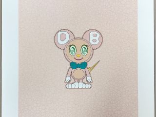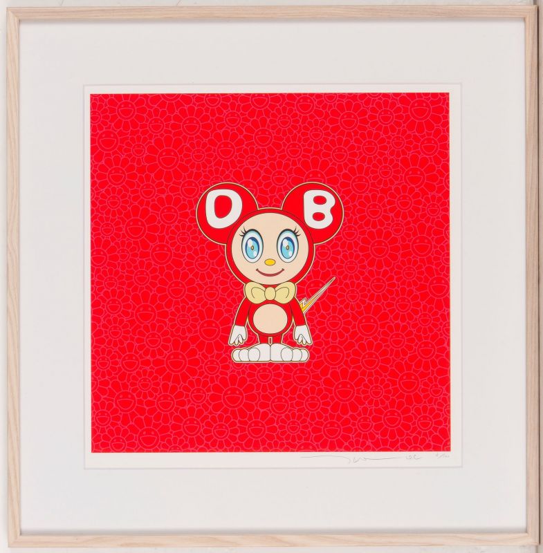 Murakami masterfully blends high art and pop culture in this piece, where a visually arresting red palette and a field of smiling flowers provide a striking stage for the innocent charm of DOB. His large, wide eyes, rounded form, and simplified features lend him a childlike quality, making him instantly lovable within the energetic composition.