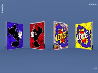 Patrick Rubinstein's "cine mickey" presents Mickey Mouse as a central figure, deconstructed and reassembled across three panels. The central panel features a classic Mickey, rendered in bold black and white against a chaotic backdrop of comic book graphics and pop culture imagery, suggesting a commentary on his enduring and omnipresent status. The side panels offer contrasting interpretations: one features Mickey in a stark, almost graphic style with red accents, while the other presents him in a solid blue against a textured background. The lenticular effect, implied by Rubinstein's style, likely adds a shifting, dynamic quality to the imagery, further enhancing the pop art aesthetic and the sense of Mickey's multifaceted presence in contemporary culture.