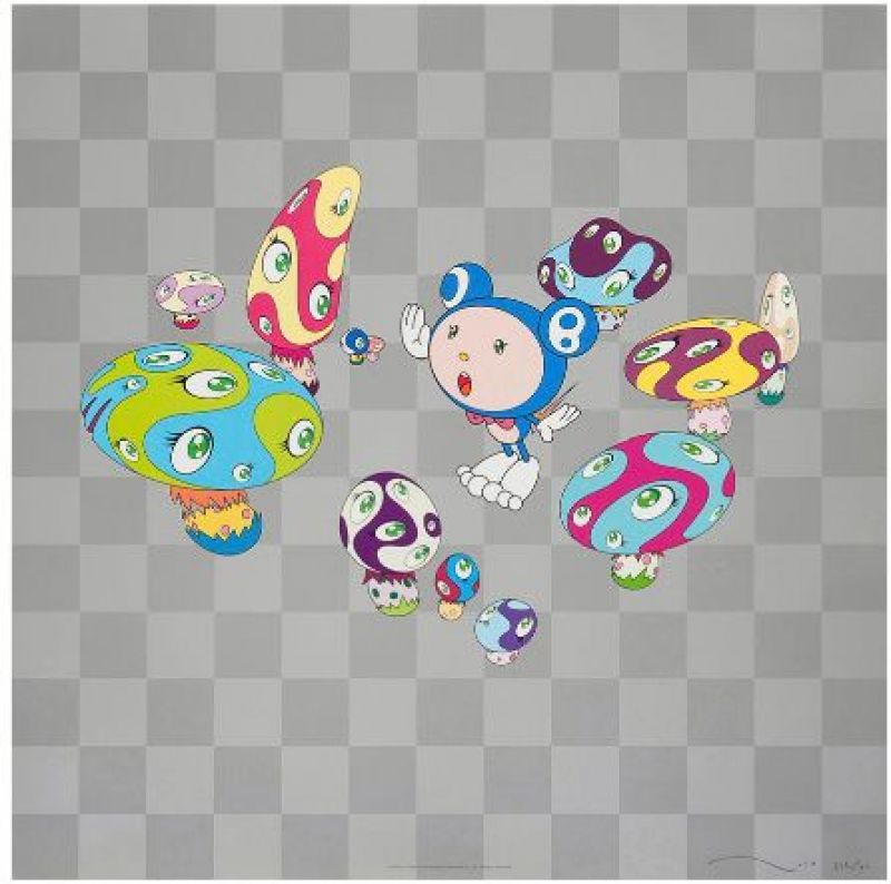 Takashi Murakami's "IN CHA!" places an imagery reminiscent of his 'DOB in the Strange Forest' series against a shimmery silver checkered background, creating an artificial, otherworldly space. Rendered in his 'Superflat' style, the figure is surrounded by whimsical mushroom-like forms, creating a visually striking contrast between smooth shapes and geometric background. This composition invites viewers into Murakami's meticulously crafted world, blending pop aesthetics with his distinct artistic vision.