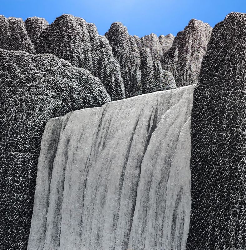Chansrinual’s breathtaking composition captures the raw power and serenity of nature, depicting a majestic waterfall cascading amidst rugged, textured cliffs. The intricate detailing of the rocky formations contrasts beautifully with the fluid motion of the water, evoking a sense of timelessness and tranquility. The monochromatic palette of the terrain highlights the interplay of light and shadow, while the vivid blue sky adds depth and vibrancy. This artwork invites viewers to immerse themselves in its meditative atmosphere, reflecting on the harmony between strength and softness, permanence and transience—an ode to the ever-evolving yet enduring beauty of nature’s landscapes.
