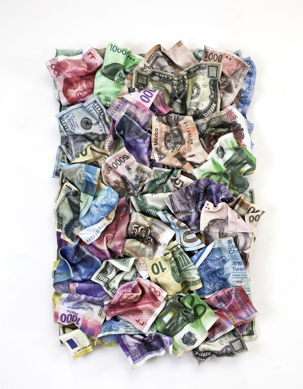 The Many Faces of Money by Paul Rousso is a dynamic sculptural collage that confronts the global currency of desire, value, and power. Crumpled and exaggerated, dozens of international banknotes—from pesos to pounds, rupees to yen—are frozen mid-motion, resembling both discarded trash and precious relics. Rousso’s hyperrealist technique distorts scale and texture to question the transient yet obsessive role of money in our lives. This artwork captures the paradox of currency as both unifier and divider, illustrating how money, in all its forms, becomes a global portrait of ambition, culture, inequality, and the relentless pursuit of worth.