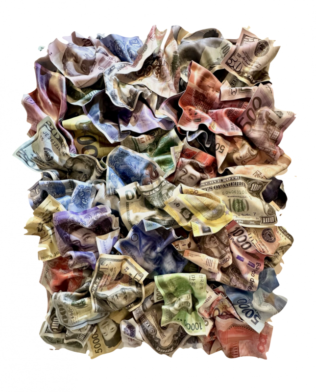 Paul Rousso's "The Colour Of Cash" is a vibrant and thought-provoking sculpture that transforms the ephemeral nature of currency into a permanent, tactile art object. Using his signature thermoforming process, Rousso meticulously sculpts various international banknotes into a dynamic, crumpled composition that spills with color and texture. The artwork's title itself, "The Colour Of Cash," highlights the often-overlooked aesthetic qualities of money, while also inviting deeper reflection on its pervasive influence in our lives. By elevating discarded or devalued currency into a visually arresting piece, Rousso compels viewers to consider the complex relationship between value, consumerism, and art, offering a fresh perspective on the material world.