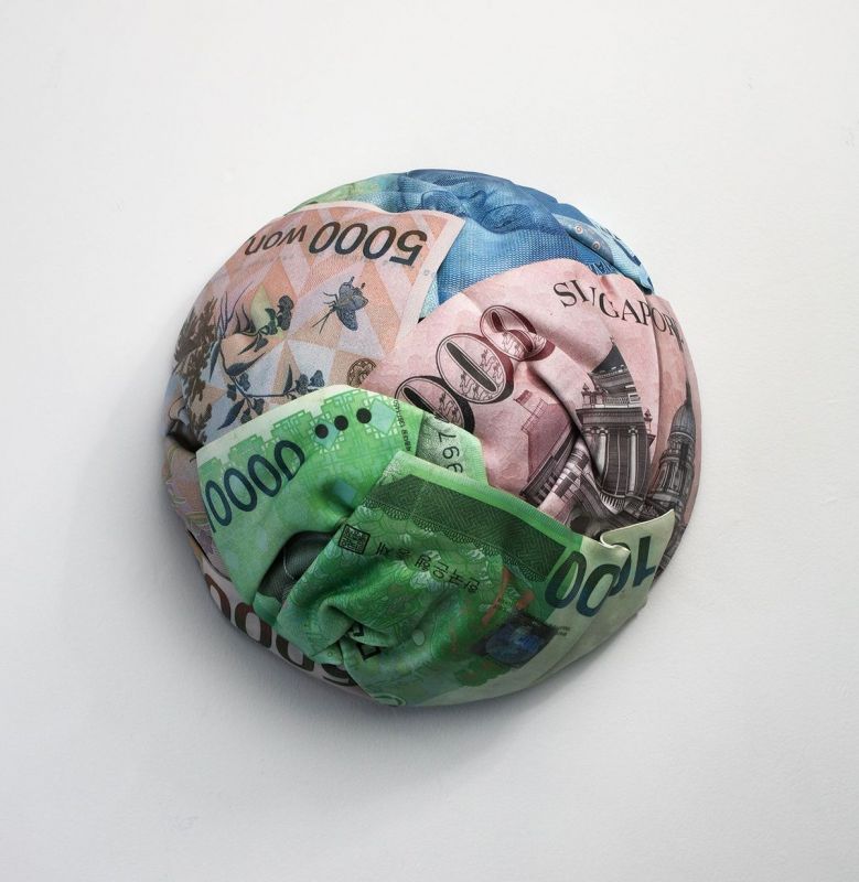 In "Asian Cash II," Paul Rousso continues his exploration of hyperrealism and the concept of value by presenting another unique spherical arrangement of Asian banknotes. This sculpture, crafted through Rousso's signature thermoforming process, features a prominent display of various denominations, with the distinctive yellow hue of the Korean 50,000 Won note catching the eye amidst other intertwined currencies. The meticulous rendering of each crinkle and fold creates an astonishingly realistic effect, prompting viewers to question whether they are observing real money or a masterful illusion. "Asian Cash II" serves as both a celebration of the diverse visual language of global finance and a subtle commentary on the physical manifestation of wealth, encapsulating the complex allure of currency in a solid, artistic form.