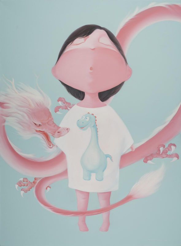 Wu Qiong’s ‘Little Dragon’s Conjecture’ portrays the main character donning a sweet playful dinosaur tee and with a pink dragon enveloping them. This speaks to Wu Qiong’s signature style of representing characters coming to terms with the world of adulthood, but still remaining distinctly childlike; a suggestion that part of us never truly lets go of childhood. This painting signifies the power of imagination and as the character has their eyes closed, their imagination comes alive.