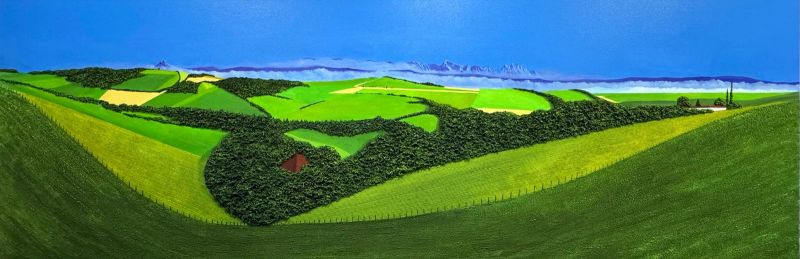 "Changing Light of Emmental" by Ronnie Ford paints a breathtaking panorama. The iconic Swiss Alps, their peaks kissed by shifting sunlight, form a majestic backdrop. In the foreground, the undulating, emerald green hills of the Emmental region roll and swell, absorbing and reflecting the changing light. The painting captures the ephemeral beauty of the moment, a dance between light and shadow across the verdant landscape and the towering alpine peaks.