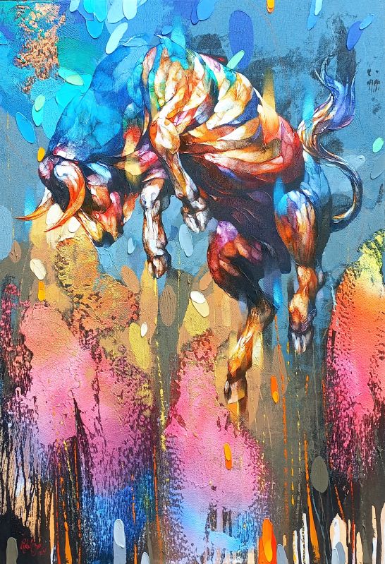 This painting explodes with the raw potential of a bull in motion. It's not a static portrait, but a glimpse of untamed energy, poised between a kick and a charge. The bull is a force of nature, ready to unleash its power. Feel the energy and connect with the primal power of this magnificent creature!