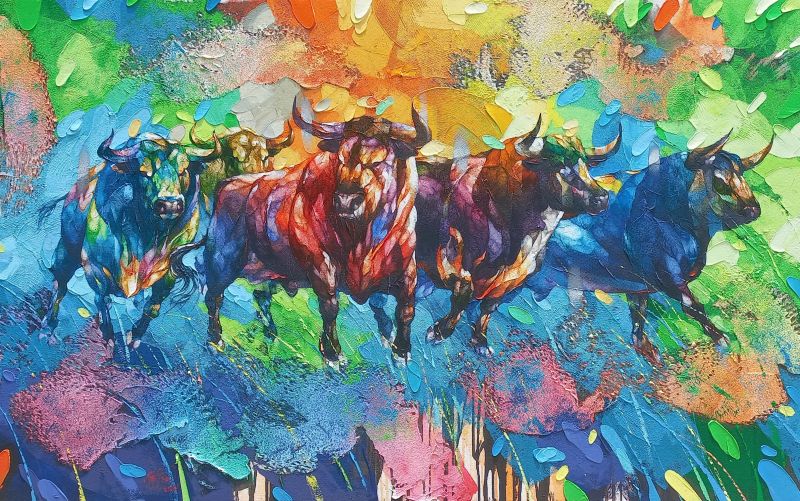 A line of powerful bulls dominates the canvas, their forms overlapping and interacting in a dynamic display of collective strength. The artist's expressive brushstrokes and rich color palette emphasize the animals' muscularity and untamed spirit. Each bull possesses a distinct coloration, adding visual interest to the group. The textured surface, created through impasto, scratching, and dripping, enhances the sense of movement and immediacy. A swirling background complements the bulls' energy, further emphasizing their power and presence. This is a compelling portrayal of primal strength and collective force.