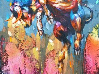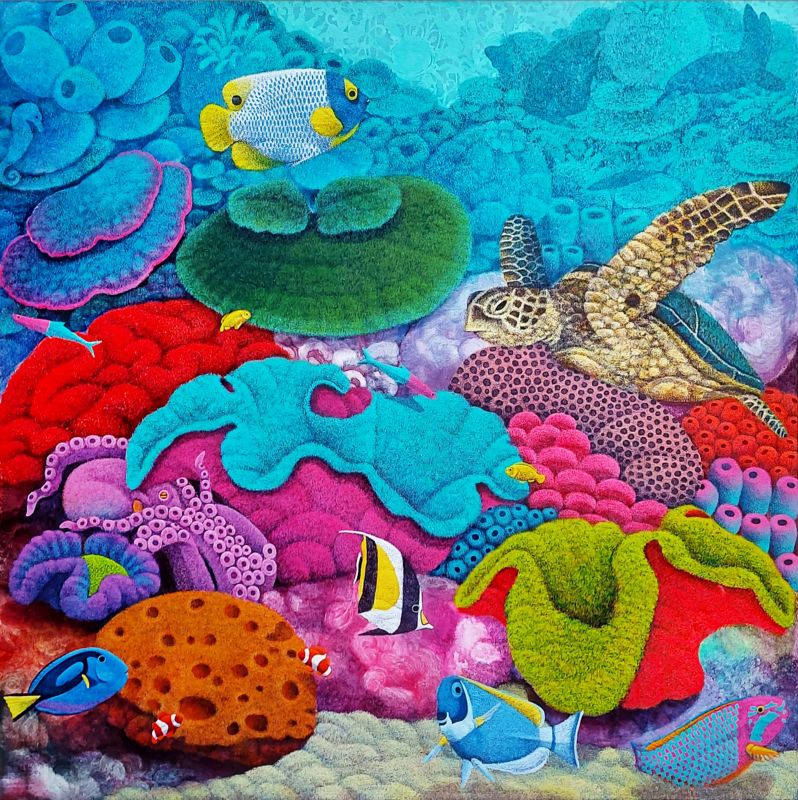 Suardana Kacor’s "Under The Sea" (Acrylic on canvas, 80 x 80 cm, 2024) is a breathtaking dive into a coral paradise, teeming with life and vibrant color. The painting offers a dynamic cross-section of a reef, where a majestic sea turtle glides gracefully above intricately textured coral formations in dazzling hues of red, magenta, green, and blue. Schools of brilliantly colored fish, including an angelfish and clownfish, navigate the complex aquatic architecture. Kacor’s distinctive technique creates a tactile impression, making the corals almost ripple with their own inner light. This artwork is a profound celebration of marine biodiversity, capturing the serene complexity and exhilarating beauty of the ocean's hidden depths.