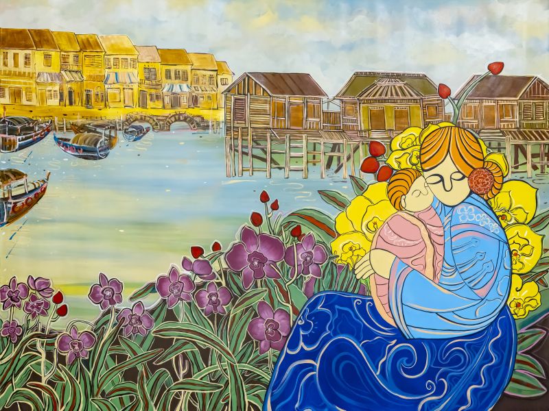 In Sarkasi Said's "Cherished Moments," a mother and child find solace amidst a vibrant cityscape. The mother, draped in a flowing blue garment, cradles her child, their figures bathed in the warm glow of the setting sun. The intricate details of the surrounding architecture and the lush foliage create a sense of tranquility and peace. The mother's gentle embrace and the child's peaceful slumber evoke a profound sense of love and protection, a moment of cherished intimacy captured in a symphony of color and light. This piece invites viewers to reflect on the preciousness of these fleeting moments, the quiet joys of motherhood, and the enduring power of love to create a haven of peace in the midst of a bustling world.