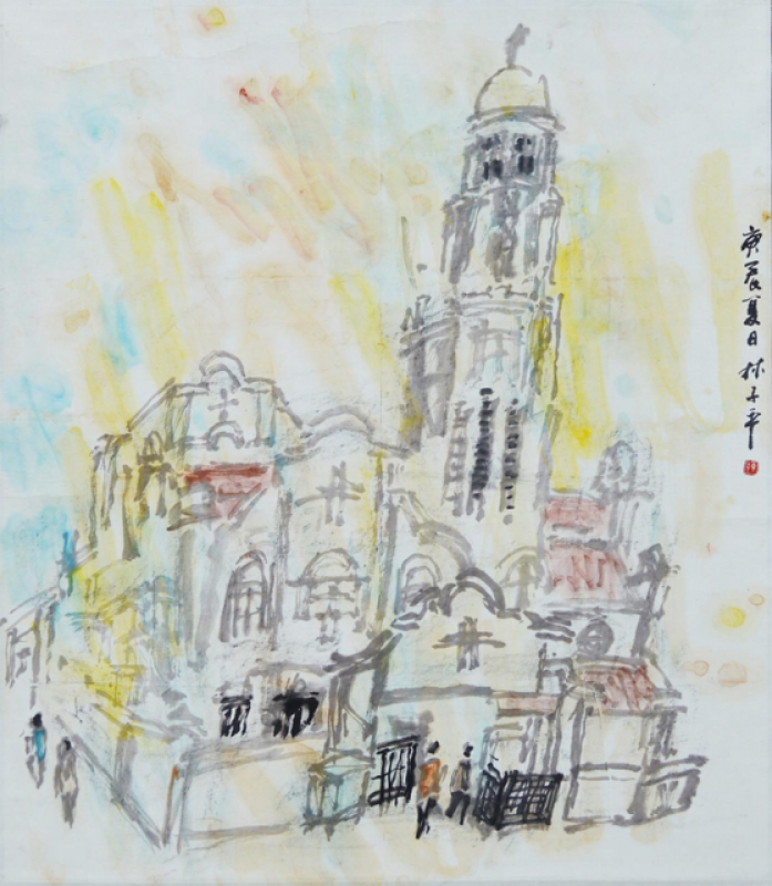 Lim Tze Peng's "Church" captures an architectural subject with a delicate, impressionistic touch. The church, depicted with a tall, central tower and ornate facade, is rendered in subtle washes of gray and white, suggesting a sense of age and history. Loose, calligraphic lines define the building's structure, while splashes of soft yellow, blue, and pink create an ethereal, atmospheric quality around it. Small figures at the base add a human element, grounding the majestic structure in everyday life. The painting's light, airy feel and the artist's signature brushwork convey a sense of fleeting beauty and quiet reverence.