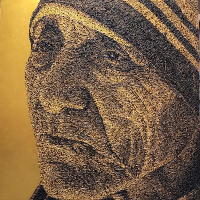 Chansrinual's artwork presents a detailed portrait of Mother Teresa, executed using the intricate piping technique. The artist skillfully employs the medium to capture the iconic nun's serene countenance, emphasizing her gentle eyes and the lines etched by years of service. The piping creates a textured, almost sculptural effect, adding depth and dimension to the portrait. The use of gold and dark tones enhances the artwork's solemn and reverent quality, reflecting the subject's spiritual significance. The piece serves as a poignant tribute to Mother Teresa, rendered in a unique and meticulous style that highlights both the artist's technical prowess and the subject's enduring legacy.