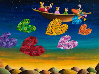 COPLU's "Harmony of Dream and Love" depicts a whimsical and dreamlike scene. A small boat with several figures floats amidst a field of stylized flowers and heart-shaped forms. The vibrant colors and rounded shapes, characteristic of COPLU's style, create a cheerful and optimistic atmosphere. The composition suggests a sense of joy, connection, and harmony, with the flowers and hearts symbolizing love and beauty. The overall effect is one of lightheartedness and a celebration of life's simple pleasures.