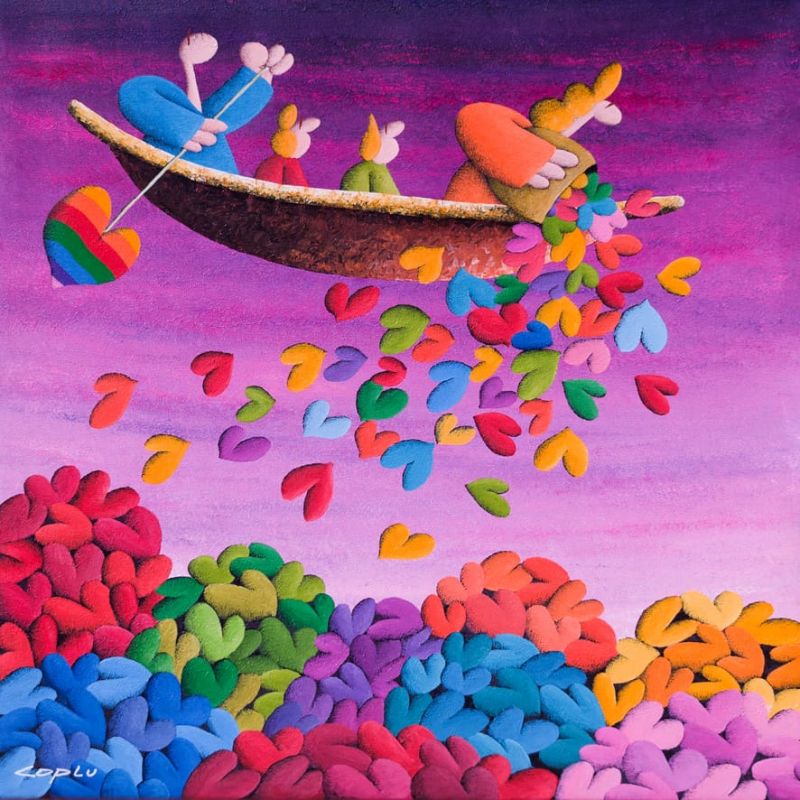 Step into a world where every gesture of affection blossoms into an invaluable gem. This vibrant acrylic piece, celebrates the profound impact of love in our daily lives. COPLU invites us to reflect on how even the smallest acts of kindness accumulate, forming a rich tapestry of treasured moments that enrich our existence. The lively colours and endearing figures characteristic of his style beautifully convey this heartwarming message, reminding us that love is the ultimate currency of life.