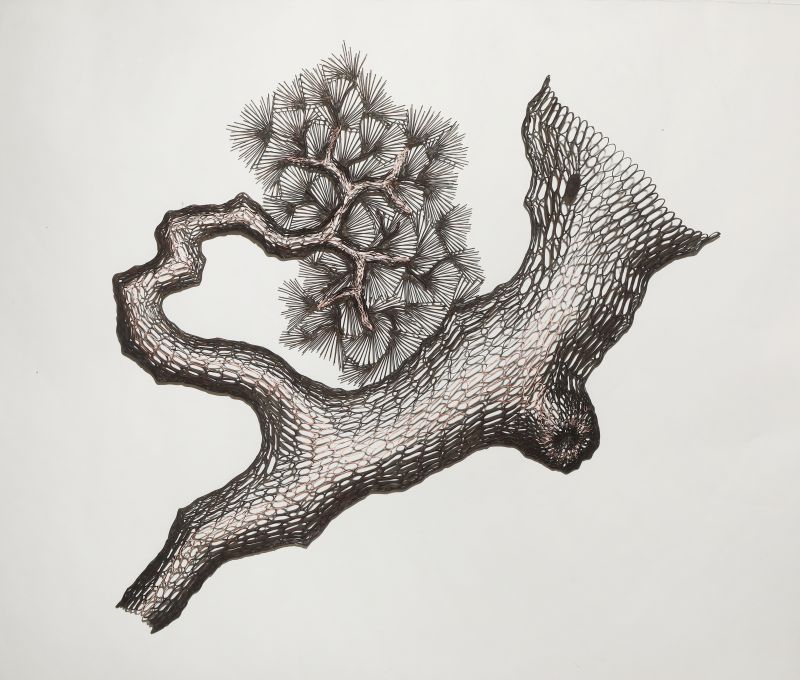 In his persistent need to create organic forms Lee Gil-Rae takes it one step further in creating man-made nature. His works consist of surreal, leafless forests that one can meander into, with spiralling branches that are unnatural in structure but organic in aesthetic. These draw the viewer in to witness the intricate exteriors that mimic the curves and notches of aged tree bark. His sprawling branches fan out and are tipped with wisps of copper representing the needles of the pine trees, in true homage to Mother Nature.