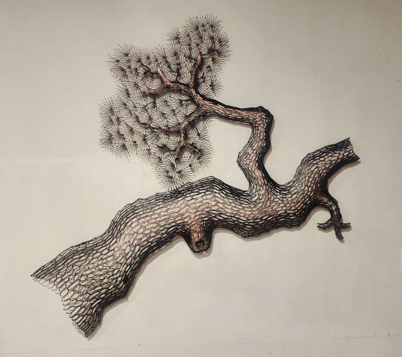 In his persistent need to create organic forms Lee Gil-Rae takes it one step further in creating man-made nature. His works consist of surreal, leafless forests that one can meander into, with spiralling branches that are unnatural in structure but organic in aesthetic. These draw the viewer in to witness the intricate exteriors that mimic the curves and notches of aged tree bark. His sprawling branches fan out and are tipped with wisps of copper representing the needles of the pine trees, in true homage to Mother Nature.